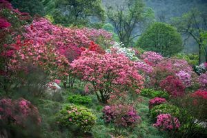 整个杜鹃谷共有三重门,近百种杜鹃品种,大部分是由高山杜鹃和春鹃品系组成。春鹃品系还有一种耳熟能详的名称就是映山红。