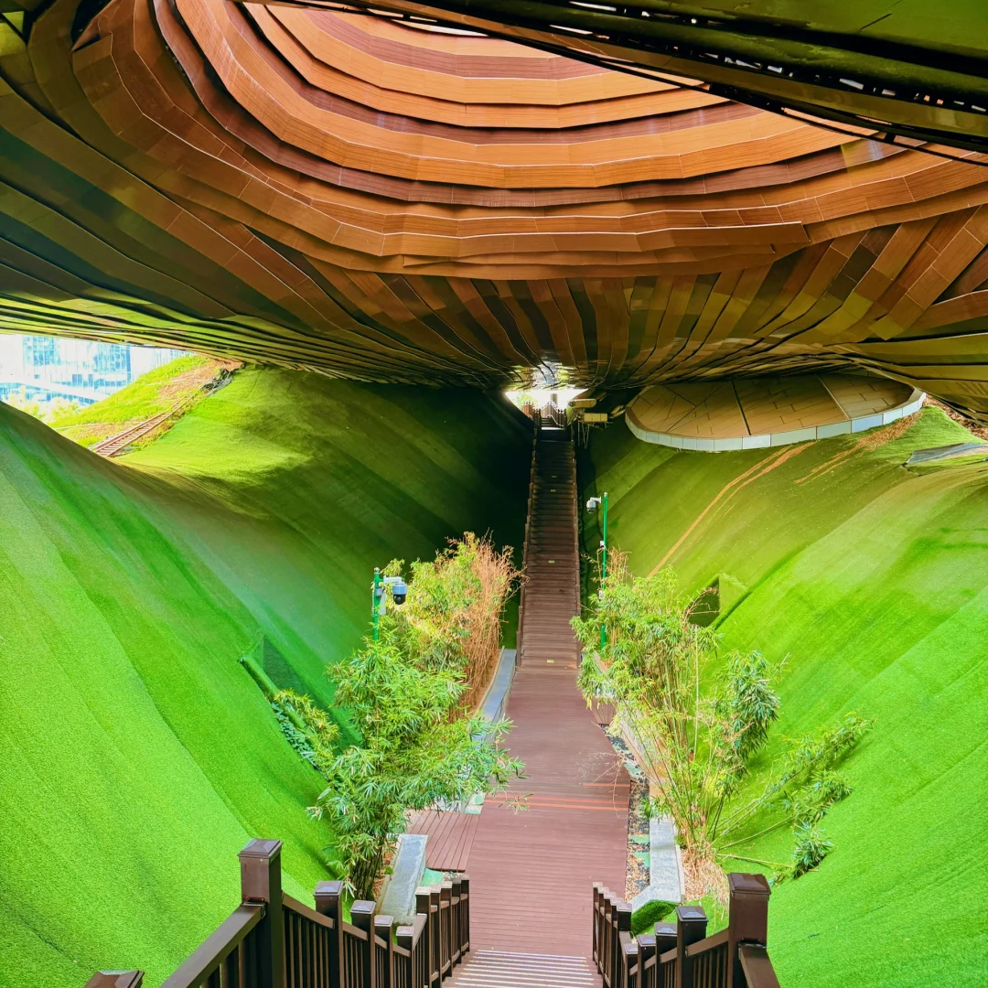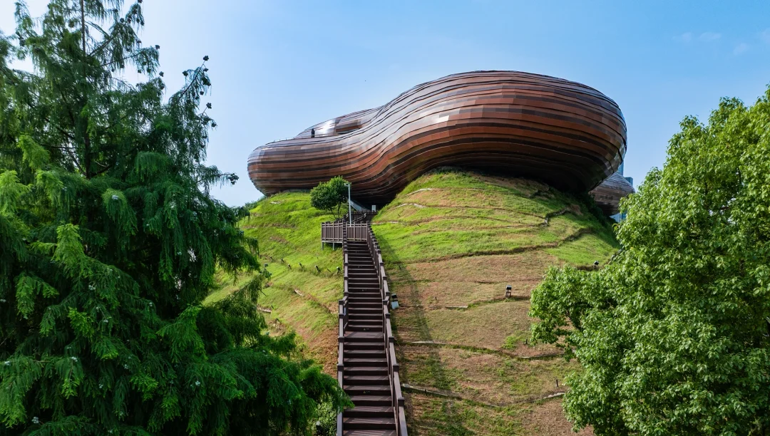 走出展厅,随时可沿馆外步梯进入建筑里,感受水滴天井洒落的阳光,仿佛置身宫崎骏漫画场景里。也可坐于馆外山体草坡上吹风,亦可登顶将燕湖和城市风光尽收眼底。燕湖波光中,历史、现在与未来在此和弦。还可远观这座博物馆,欣赏和品味这座以东汉蔡邕亲手制作的焦尾琴为灵感的前卫建筑。