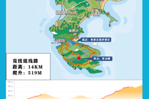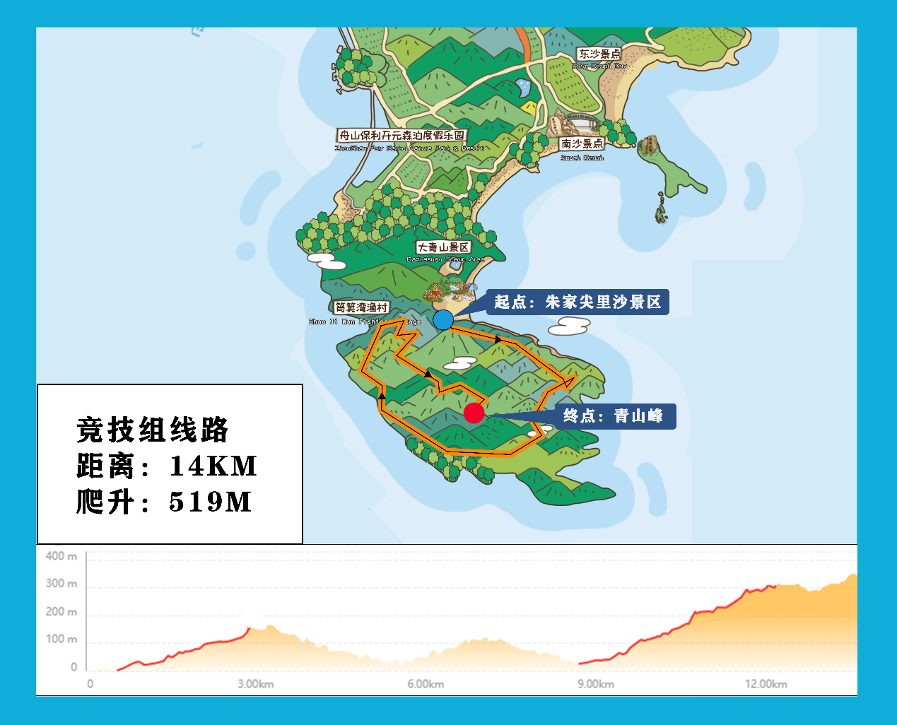 竞技组:朱家尖里沙景区—沿庙筲线—顺时针绕大青山一圈后在大青山景区西门附近上山—过转盘后右转向四姑坪方向—青山峰(终点),全程14公里。关门时间70分钟,全程封道