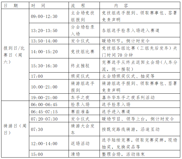 选手报到、品牌展会、车手之夜、开幕仪式、爬坡赛、骑游大会等