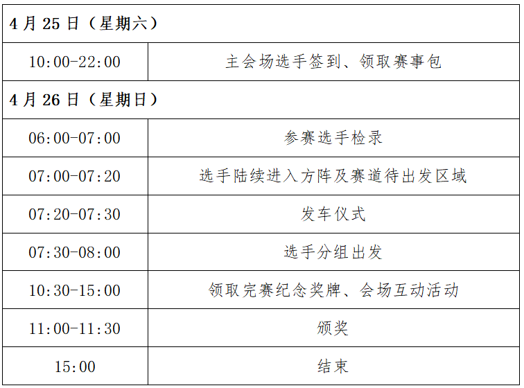 (四)关门距离及道路解封时间为了保证参赛选手比赛安全、顺利,比赛期间比赛路线各段设关门时间(道路解封时间),限时对社会交通封闭。超过关门时间后,相应路段恢复社会交通。在规定的关门时间内,未完成对应距离的参赛选手须立即停止比赛,退出赛道,以免发生危险。退出比赛的选手可乘坐组委会提供的收容车到达终点。关门时间按自然时间计算。
