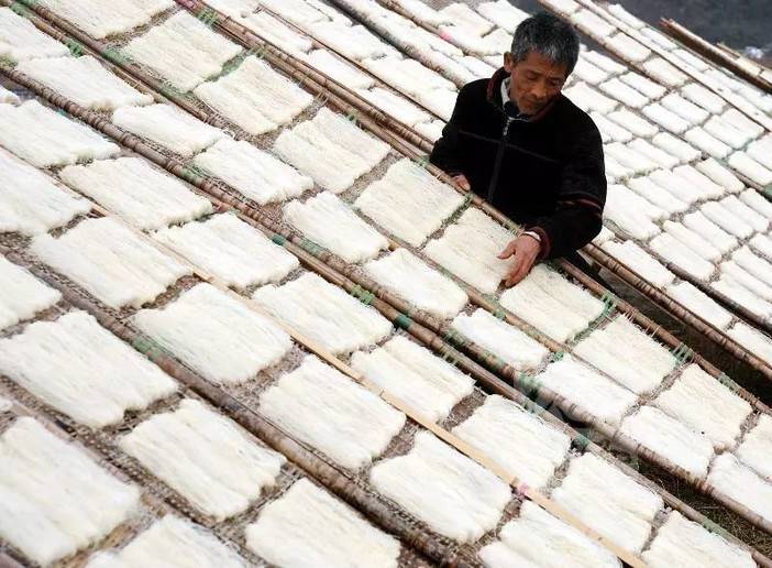 粉干原材料是海溪乡梯田上种植的稻米,沐浴着微风和山雨,大自然最温暖干净的阳光,风出稻浪,最纯粹原态的生长方式。海溪乡地处大山中的天然盆地,四面环山,是粉干晾晒的绝佳晒场。